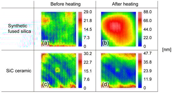 The differences in the temperature distributions between the synthetic fused silica and SiC ceramic substrates (Figure 2 and Figure 4) are likely caused by the differences in the thermal conductivities of the materials, because the heat capacities of the synthetic fused silica and SiC ceramic are similar (Table 1). In the synthetic fused silica substrate, the temperature near the irradiated surface increases locally because the heat spreads slowly due to the low thermal conductivity of 1.38 W/(m·K). On the other hand, the higher thermal conductivity of the sintered SiC ceramic is 181 W/(m·K), more than 130 times higher than that of the synthetic fused silica, resulting in a lower peak temperature and a uniform temperature distribution. The thermal expansion coefficient of the SiC ceramic is ~6 times higher than that of synthetic fused silica (Table 1); however, the uniform temperature distribution in the SiC ceramic suppresses the degradation of surface accuracy (Figure 3 and Figure 5).