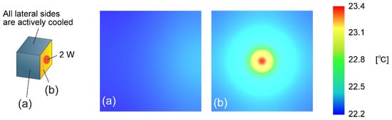Calculated temperature distributions of the SiC ceramic substrate cooled from the lateral sides of the substrate at 22 °C. Calculated temperature distributions on the (a) lateral side surface and (b) mirror surface.