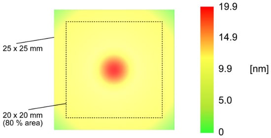 Considering the application of SiC ceramic to use in gratings for high-average-power, high-intensity CPA laser systems, the thermal transport in vacuum also needs to be considered. One option is using active water-cooling for in vacuum heat removal. Figure 6 shows calculation results using the LASCAD software (version 3.6.5) [17] of the temperature distribution in the sintered SiC ceramic substrate actively cooled from all lateral sides of the substrate at a temperature of 22 °C. The thermal transmittance for the active cooling is set to 3000 W/(m2·K) in the calculation. The ceramic dimensions and heating conditions are set to be the same as the experimental values described above. A uniform temperature distribution is shown on the lateral side surface, reflecting what was observed experimentally for the in-air case (Figure 4d), with a temperature increase of ~0.3 °C. The maximum temperature at the mirror surface was just 1.4 °C above the initial temperature due to the active cooling, which reduced the deformation at the mirror surface to a maximum of ~17 nm in the center area (Figure 7). Therefore, active water cooling could potentially be used for a ceramic grating in vacuum to effectively mitigate thermal expansion.