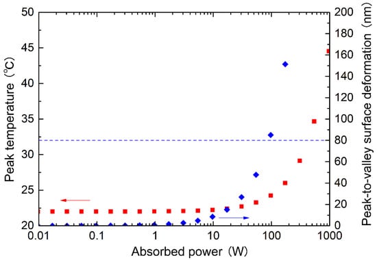 Calculated peak temperature (red square) and peak-to-valley surface deformation (blue diamond) for 50 × 27 × 4 cm SiC ceramic substrate. Dashed line shows the deformation limit (80 nm) of grating.