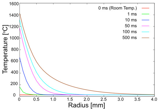To confirm the measurement, we performed a time-dependent thermal heat transport simulation in polar coordinates with radial symmetric, including thermal conductivity and radiation. In the simulations, the CW laser had a Gaussian profile with four times the standard deviation σ (D4σ beam width) of 1 mm, and the absorption of the CW laser to thermal energy in the Ti tape was assumed to be 50% [28]. The simulation assumed that the initial temperature of the system was room temperature (i.e., 24 °C). The simulated temperature as a function of radius is shown in Figure 2 for different times after the start of irradiation. The simulations indicated a localized region several mm in size with a temperature above 100 °C as well as a smaller region with a temperature beyond 1000 °C, showing good agreement with the IR thermography measurement shown in Figure 1b. The simulation suggests that 100 ms is sufficient to reach more than 1000 °C over a spatial scale significantly larger than a typical high-power laser focal spot, indicating that the CW laser heating could in principle operate at a rate of up to ~10 Hz. Although high-power laser-driven ion acceleration experiments are currently typically performed on a single-shot basis, this technique could be applied to operations up to 10 Hz.