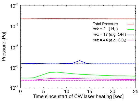 Quadrupole mass spectrometer (QMS) measurement of the partial pressures of different molecular masses as a function of time after the start of laser heating, shown with solid lines. Dashed lines represent the initial pressures before CW laser heating.