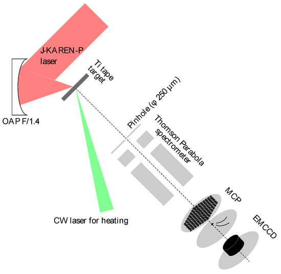 The petawatt class J-KAREN-P laser [31,32] at National Institutes for Quantum and Radiological Science and Technology (QST) based on chirped pulse amplification in Ti:Sapphire crystals combined with OPCPA pre-amplifiers operates in the full power mode at a rate of up to 0.1 Hz. It was used on a single shot basis to investigate ion acceleration from the CW laser-heated Ti tape targets described above. In this experiment, the central wavelength of J-KAREN-P is λL ~810 nm, with an on-target pulse energy EL ~10 J, and pulse length τL ~40 fs (Full width at half maximum, FWHM). An F/1.4 off-axis parabola (OAP) focused the pulse to a focal spot size dL ~1.5 μm (FWHM), resulting in a peak intensity IL ~5 × 1021 W/cm2 taking account of the encircled energy, which was used to irradiate Ti tape targets with 5 µm thickness at 45° with p-polarization, as shown in Figure 4. A more detailed picture of the tape target system is shown in Figure 1a. The tape is reeled between two rotators with two support bars, providing an accuracy of the target position to within the Rayleigh length of the focused laser, ~8 μm. The tape targets were installed in a vacuum chamber with a pressure below ~10−3 Pa.