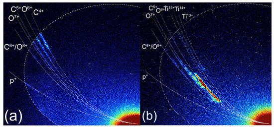 The brightest ion track shown in Figure 5b corresponds to O6+, and significantly dimmer lines for C5+, O7+ and C6+/O8+ were also observed, but no proton signal was visible above the background level. Interestingly, the oxygen lines do not continue to the detectable minimum energy, indicating non-thermal-like ion distribution. Signal consistent with Ti ions is also observed with the CW laser heating. However, the traces of Ti ions are not resolved clearly as the flux was relatively low. Based on the assumption that 48Ti was the dominant isotope present in the tape target, the Ti charge states were estimated to be Ti13+, Ti14+, and Ti15+, as shown in Figure 5b. The ionization potentials of Ti13+ and Ti14+ are 787 eV and 864 eV, respectively [33]. These are in a similar range to the ionization potentials of O7+ and O8+, which are 739 eV and 871 eV, respectively.