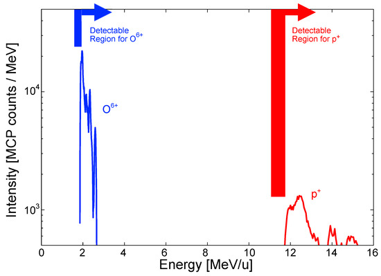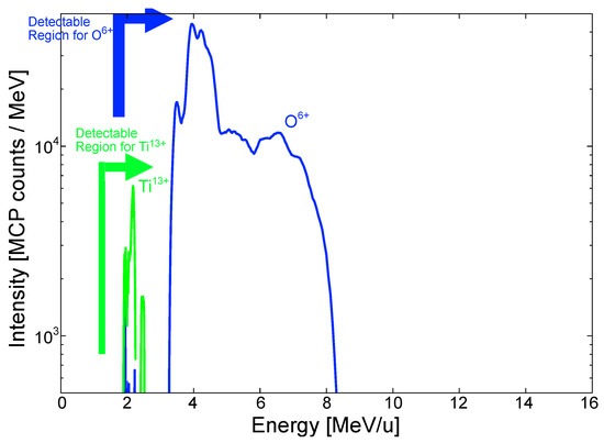 Figure 5 shows that Ti ions were only detected when CW laser heating was applied, indicating that removal of contaminants by CW laser heating has a significant effect on the ion acceleration dynamics in the sheath field. The Ti ions are shielded by the O6+–O8+ ions, which have a higher Q/A and are accelerated more efficiently by the sheath field. In order to confirm this mechanism, we again apply Equation (1) to consider the potential required to achieve the minimum value of EO6+ = 3.3 ± 0.1 MeV/u, which is ΦO6+ = 8.8 ± 0.3 MV. In the case of 48Ti13+, Figure 7 shows a maximum measured energy of 2.5 ± 0.1 MeV/u that corresponds to ΦTi13+ = 9.2 ± 0.4 MV. Therefore, we can conclude that in the thin titanium oxide layer exposed by the CW laser heating, Ti ions with a lower Q/A are accelerated successively after the oxygen ions with higher Q/A.