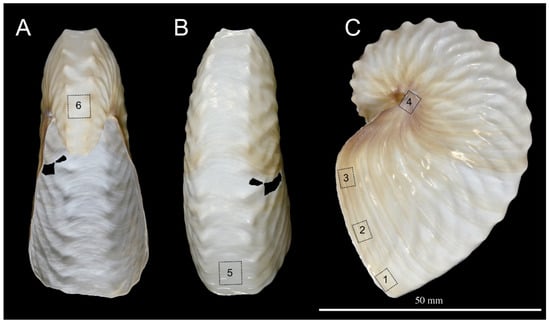 Macrophotography of the shell of Argonauta hians. (A). Apertural view. (B). Dorsal view. (C). Left lateral view. Note the pigmented protuberances of the keel. The dashed squares with numbers indicate the location of area sampled for SEM investigation of the shell wall.