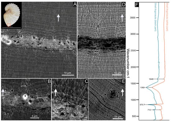 - Oudot, M.; Neige, P.; Ben, S.I.; Schmidt, A.; Strugnell, J.M.; Plasseraud, L.; Broussard, C.; Hoffmann, R.; Lukeneder, A.; Marin, F. The shell matrix and microstructure of the Ram’s Horn squid: Molecular and structural characterization. J. Struct. Biol. 2020, 211, 107507. [Google Scholar] [CrossRef] [PubMed]