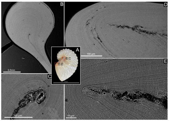 Shell fragments were embedded in LR (London Resin) White resin, following the manufacturer’s instructions (Fluka): benzoyl peroxide (catalyst) was dissolved in the LR White resin monomer solution (9.9 g per 500 mL) for 24 h, under constant stirring, at room temperature, prior to use. The samples were immersed in the resin solution at room temperature before being transferred at 60 °C for the polymerization to proceed (one night to two days). Resin blocks were then sliced with a saw microtome (Leica SP1600, Leica Biosystems, Nussloch, Germany): shell sections were polished under water with decreasing grain size sandpaper until reaching mirror-polish quality (0.05 µm, aluminium oxide). After short sonication, the preparations were slightly etched with EDTA solution (1% wt/vol, 2 min), before being dried and carbon or gold-sputtered. The samples were finally observed with a Hitachi TM-1000 (Hitachi, Tokyo, Japan) tabletop SEM or with a JEOL JSM-IT 100 InTouchScope™ (JEOL Ltd., Tokyo, Japan).