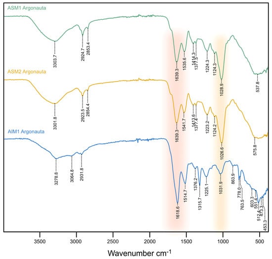 FT-IR spectra of three shell extracts acquired in Attenuated Total Reflectance mode (ATR). Note that the two ASMs, in spite of the extended bleaching treatment for ASM2, are almost superimposable. Due to low quantity, AIM2 could not be analyzed.