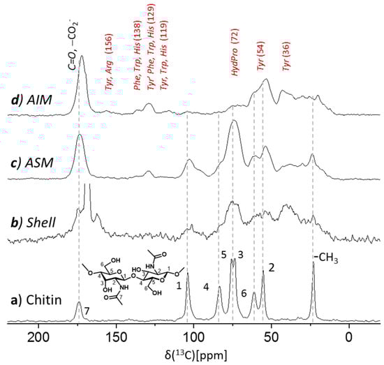75.4 MHz 13C CPMAS spectra of (a) of α-chitin standard (shrimp), (b) the cleaned shell of Argonauta hians (vertically extended), and of its extracts (c) acid soluble and (d) acid insoluble matrices (AIM1 and ASM1). AIM of A. hians shells is primarily proteinaceous content while (oligo)saccharides (characteristic shifts of chitin indicated by the dashed line), if present, comprise less than a 10% fraction. ASM exhibits a pronounced oligosaccharide(s) content and less pronounced proteinaceous content.