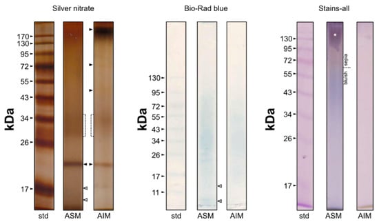 On silver-stained gels, the AIM electrophoretic profile resembles that of ASM, with a prominent band at 19 KDa, a smearing pattern along the whole lane and a denser staining between 30 and 35 KDa. A few differences are also observed: the top of the lane is densely stained dark brown around 170–180 KDa; two discrete bands are observed at 71 and 46 KDa, respectively. AIM stains poorly with Bio-Rad blue dye, and in a similar manner as the ASM. Finally, Stains-all evidences only a light pinkish smearing, more densely stained in the top of the gel while the migration front is stained brown.