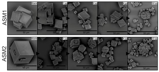 The effect of the ASM extract of A. hians on calcium carbonate crystallization was tested in the range (0.5–32 µg/well). Figure 8 shows only a few concentrations (1, 2, 4, 32 µg/well). Up to 1–2 µm/well, we do not detect any effect. From 4 to 32 µg/well, the main effect lies in the size reduction but the polycrystals remain unchanged in their shape (e.g., no rounded angles). One can observe that no significant difference can be noticed between ASM1 and ASM2. In general, the two soluble matrices exert weak effects, even at high concentrations.