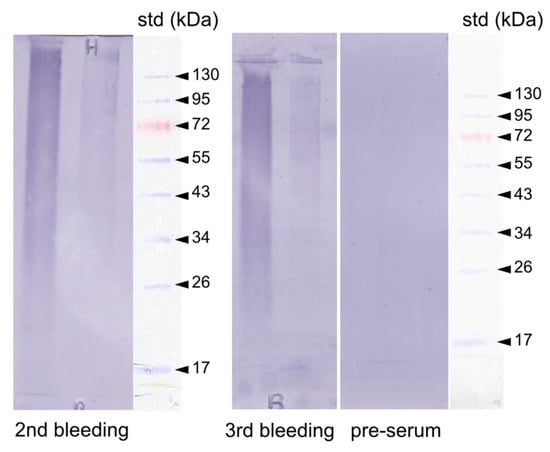 Following the ELISA results, we performed a Western-blot of the two extracts (AIM1, ASM1), which were allowed to react with the anti-P95 antibody (1st and 3rd bleeding). The results are shown in Figure 9. A marked staining is evidenced in both extracts, with a higher intensity in the ASM. In both cases, the reactivity is characterized by a smear, which is more pronounced towards high molecular weights. None of the discrete bands observed in the SDS-PAGE are visible.