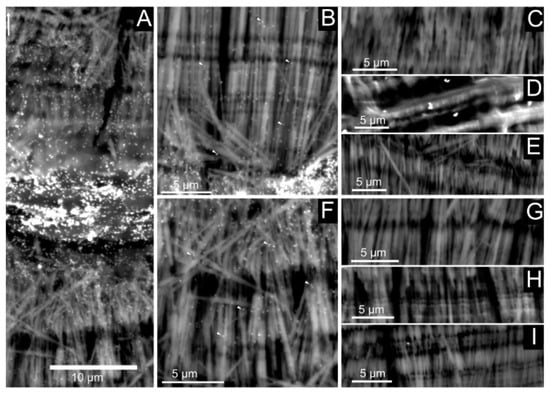 The results of the lectin gold labeling are shown in Figure 11. The left panel (Figure 11A) is a general view of the shell cross-section, marked by the central organic layer. The central panel corresponds to a magnification of the upper and lower layers (Figure 11B,F), and the right one (Figure 11C–E,G–I), to different negative controls (respectively, from top to bottom, without ConA, without GABIO, and an absolute blank). Because the spots are tiny (approx. 100 nm), we have indicated the position of few of them by black arrows. The labeling is not continuous—i.e., the spots are not aligned with the depositional surfaces of the calcite fibers—but rather disperse among the fibers. We observed that the labeling tends to be more pronounced aside the central core than at the periphery of the shell wall. None of the negative controls exhibit such a signal.