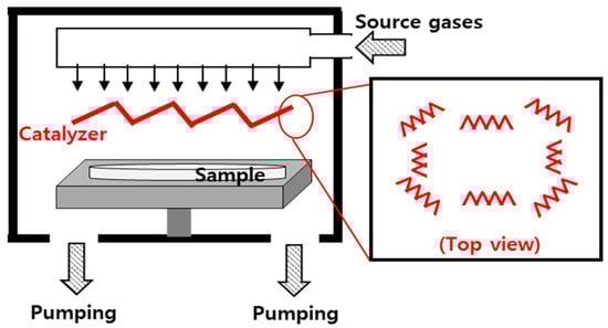 The Cat-CVD system used in this work is illustrated in Figure 1 where a tungsten wire with a diameter of 0.7 mm was used as a catalyzer located at a distance of ~70 mm apart from the substrate. Catalyzers were placed in an octagon between the gas injection and the substrate, and the full length was ~2.9 m. The catalyzer temperature was monitored by the resistance of the tungsten wire.