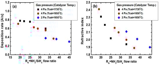 (a) Deposition rate and (b) refractive index versus NH3/SiH4 flow ratio as a function of gas pressure.