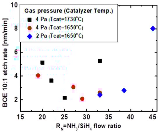 To optimize the SiNx deposition process, the films were deposited on Si wafers using a Cat-CVD system with SiH4 and NH3 gas mixtures, during which the gas pressure, flow rate, and catalyzer temperature were varied as the process parameters. The deposition rate, refractive index, and buffered oxide etchant (BOE) etch rate of each film were measured to evaluate the film quality. Detailed process conditions and measurement results are summarized in Table 1.