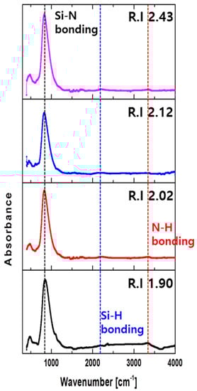 Figure 4 shows the FT-IR absorption spectra of the selected films. The IR absorption spectra exhibited peaks at 830 cm−1, 2100 cm−1, and 3350 cm−1, corresponding to Si–N, Si–H, and N–H bonding, respectively []. The relative hydrogen concentration in atomic % was determined from the bond concentrations calculated from the FT-IR spectra. The hydrogen content of the film with a refractive index of 2.12 was 6%, which was significantly lower than that of the reference sample.