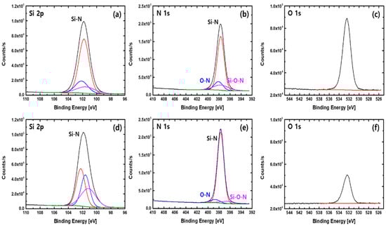 XPS spectra for Cat-CVD SiNx deposited with reference and optimized conditions with refractive index values of 1.90 and 2.12, respectively; (a–c) reference film and (d–f) optimized film.