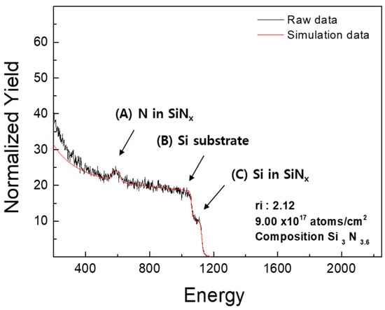 As shown in Figure 6, a Rutherford Backscattering Spectrometry (RBS) analysis was carried out to investigate the stoichiometry of the film with a refractive index of 2.12 where a 115 nm thick film was used to obtain reliable analysis data. The stoichiometry of SiNx film defined by x = [N]/[Si] was 1.2, which was lower than the standard stoichiometric Si3N4 film of 1.33 [,]. The smaller x value indicates a Si-rich thin film compared to the stoichiometric Si3N4 film, which is associated with positive charges in the film.