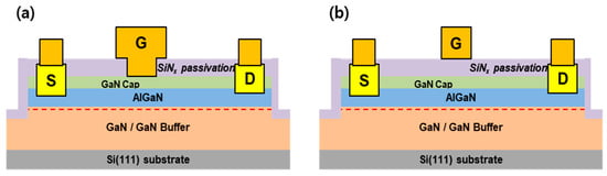 Cross-sectional schematics of fabricated (a) Schottky and (b) metal-insulator-semiconductor (MIS) gate AlGaN/GaN-on-Si high electron mobility transistors (HEMTs) with SiNx passivation films.