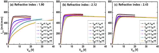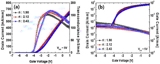 It was observed that the maximum drain current and transconductance were enhanced along with the off-state drain current reduction as the refractive index of the passivation layer increased. As revealed in Figure 8, the maximum drain current density and transconductance of the device for the optimized passivation process condition with a refractive index of 2.12 are 670 mA/mm and 162 mS/mm, respectively.