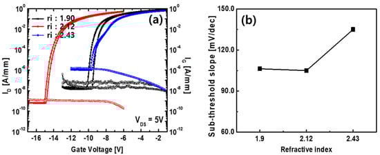 (a) Transfer and (b) sub-threshold slope characteristics of MIS AlGaN/GaN-on-Si HEMTs with 30 nm SiNx layers with different refractive indices. The measurements were carried out at VD = 5 V.