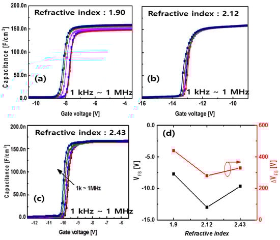 (a–c) Frequency dispersion characteristics from 1 kHz to 1 MHz of a 30 nm SiNx dielectric layer. (d) Flat-band voltage (VFB) and hysteresis (∆VFB) of the MIS gate AlGaN/GaN-on-Si HEMTs for different refractive indices. The inset of (d) is a schematic view of the C-V measurement pattern.