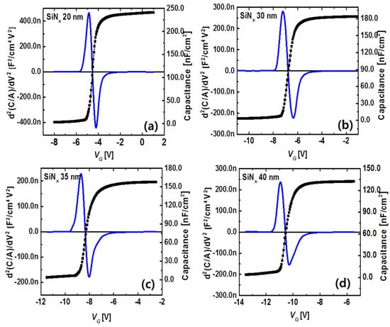 Flat-band voltages extracted by the second derivative method from C-V characteristics: (a) 20 nm, (b) 30 nm, (c) 35 nm, and (d) 40 nm SiNx films.