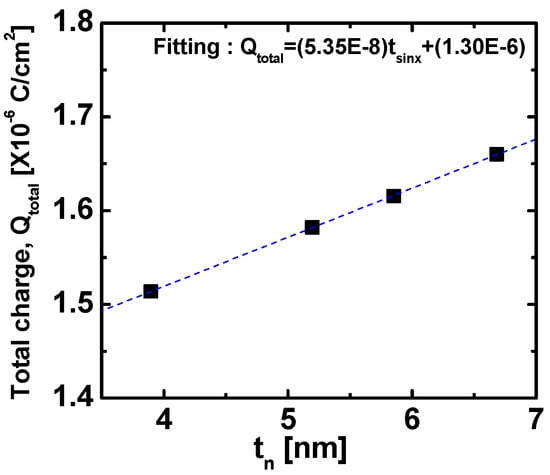 where VFB is the flat-band voltage, WMS is the work function difference between the metal and semiconductor, Qint is the total charge, Qbulk is the bulk charge, and tox is the dielectric thickness. The total charge densities as a function of the SiNx film thickness are indicated in Figure 14.