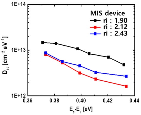 The epitaxial layers consisted of a 2 nm GaN capping layer, 20 nm AlGaN barrier layer, 300 nm undoped GaN layer, and 1.6 μm GaN buffer layer grown on a Si (111) substrate. After solvent cleaning, 40 nm thick SiNx film was deposited using a Cat-CVD system to protect the GaN surface during high-temperature ohmic annealing. Ohmic contacts with a source-to-drain distance of 6 μm were formed by low-damage recess etching using a BCl3/Cl2-based plasma process prior to Si/Ti/Al/Mo/Au (=5/20/80/35/50 nm) metallization []. The ohmic contacts were annealed by a rapid thermal annealing process at 800 °C for 1 min in N2 ambient. Mesa isolation was then performed by a BCl3/Cl2 plasma etching process with a relatively higher plasma power. The SiNx protection layer was removed by an SF6-based low-damage plasma etching process in order to eliminate any surface damage during ohmic annealing. A new SiNx film with a thickness of 30 nm was deposited again as a passivation layer using the same Cat-CVD system. SiNx films with three different refractive index values (1.9, 2.12, and 2.43) were deposited for comparison. The deposition conditions for each refractive index value were identical to those shown in Table 1. Post-deposition annealing was conducted at 500 °C for 10 min in N2 ambient. Finally, a gate foot length of 1.5 μm was defined by photolithography, under which the SiNx layer was etched by an SF6 plasma etching process. A Ni/Mo/Au (=40/15/400 nm) metal stack was used for the Schottky gate contact with a gate overhang length of 0.5 μm toward the source and drain contacts. Metal-insulator-semiconductor (MIS) gate devices with the same gate process on the SiNx passivation layer were fabricated without etching for analyzing the interface quality. The cross-sectional schematics of the Schottky and MIS gate HEMTs are presented in Figure 7.