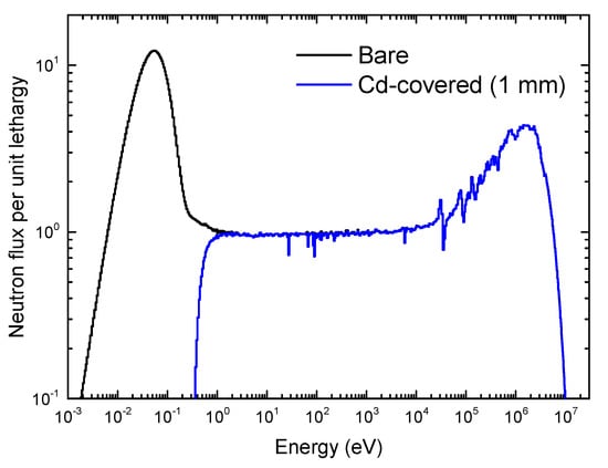 Neutron spectra in the Jozef Stefan Institute (JSI) TRIGA pneumatic tube (PT) irradiation channel, corresponding to bare and Cd-covered irradiations, obtained by means of Monte Carlo simulations and subsequently characterized on the basis of experimental neutron activation measurements.