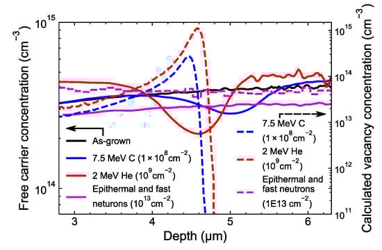 Figure 2 shows the effect of ion implantation and neutron irradiation on the free carrier concentration profile of 4H-SiC SBDs. Introduced defects caused a reduction of free carrier concentration as the free carriers were captured by the introduced acceptor deep levels. In as-grown and neutron irradiated SBDs, a homogenous free carrier concentration was observed. The free carrier concentration in 7.5 MeV C ion implanted SBDs had a minimum at a depth of 4.8–5.0 μm close to the calculated ion depth range at 4.55 μm. Likewise, in 2 MeV He ion implanted SBDs the minimum of the free carrier concentration and ion depth range were at 4.5–4.9 μm and 4.67 μm, respectively.