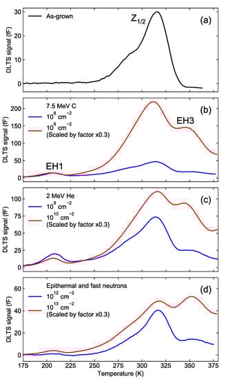- Storasta, L.; Bergman, J.P.; Janzén, E.; Henry, A.; Lu, J. Deep levels created by low energy electron irradiation in 4H-SiC. J. Appl. Phys. 2004, 96, 4909–4915. [Google Scholar] [CrossRef]