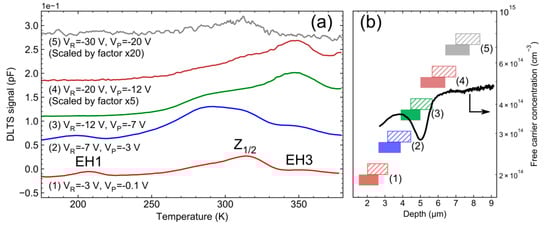 Figure 5a shows the DLTS spectra of 7.5 MeV C implanted (108 cm−2) SBD with different bias settings for probing deep levels in the adjacent depth ranges. The EH1 and EH3 defects located in the depth regions illustrated by hatched and solid rectangles in Figure 5b contribute to their DLTS signals at 210 K and 350 K shown in Figure 5a. Defects in different probed depth regions were mutually compared in regard with the measured free carrier concentration (black line), which exhibited a minimum due to carrier capture in the introduced acceptor levels. We assumed that the concentration of the introduced acceptor levels is the largest approximately at the position of the minimum in free carrier concentration. The amplitudes of peaks assigned to EH1 and EH3 defects are roughly the same in the DLTS spectrum obtained probing the depth region closest to the surface (red and blue curves), which is in agreement with reports of other authors [,]. The peak assigned to the EH3 defect shows a rapid increase, while the peak assigned to the EH1 defect disappeared in the region coinciding with the minimum in free carrier concentration (green curve in Figure 5a). The peak assigned to the EH3 defect had the largest amplitude in the DLTS spectrum, which was showing deep levels in the depth range beyond the minimum of free carrier concentration, while the peak assigned to the EH1 defect was not observed in that region (brown curve in Figure 5a). DLTS spectrum probing the depth region farthest from the ion implanted region (gray curve) contained only one small peak, the Z1/2 defect, which was present in as-grown 4H-SiC. DLTS measurements on 2 MeV He implanted (109 cm−2) SBD show that concentrations of EH1, Z1/2, and EH3 deep levels varied with depth in the same way as in the case of 7.5 MeV C implanted (108 cm−2) SBD (see Figure S2).