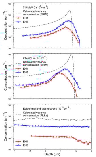 Depth concentration profiles for EH1 and EH3 deep levels and total introduced vacancies calculated by SRIM and Fluka software [,]. The lambda effect was taken into account []. Depth profiling measurements were carried out at the temperatures of 210 K and 350 K.