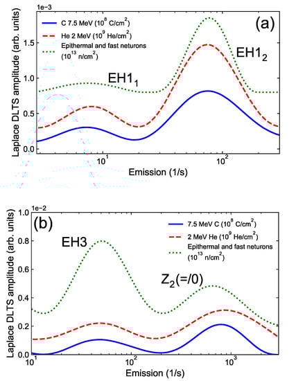 Laplace DLTS spectra for EH1 and EH3 deep levels are shown in Figure 7. The observed EH3 peak was broad and in the vicinity of other peaks, like Z2 (=/0), which affected the resolution. Contrary to EH1 peak, which was recently resolved into two emission lines [], the EH3 peak could not be resolved by the Laplace DLTS technique. Moreover, a presence of an unresolved deep level, which is indicated by the measured concentration profiles (Figure 6), could lead to the broadening of the EH3 peak in the Laplace spectra. The used FLOG numerical routine calculated the Laplace DLTS spectra with the least possible number of peaks, which described well the measured capacitance transient, consistent with the measured data points and signal to noise ratio []. It is challenging to resolve a higher number of deep levels with closely spaced emissions. However, the matching of the Laplace DLTS spectra (for EH1 and EH3 deep levels) confirmed the observation of the same type of defects.