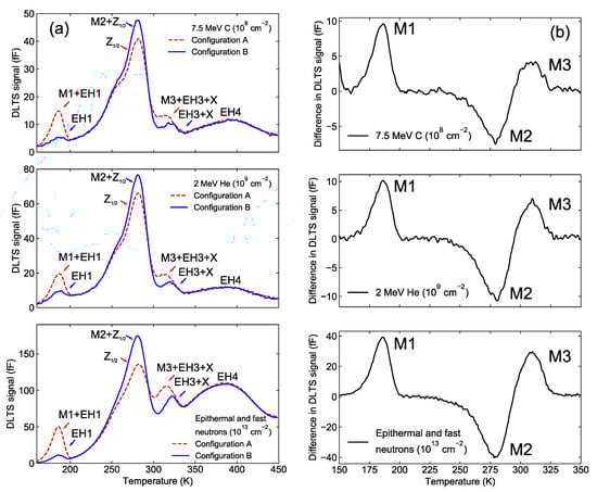 Two deep levels with energies around EC—0.4 eV and EC—0.7 eV (usually labeled as S1 and S2 or EH1 and EH3, respectively [,,,,,,]) can be observed in n-type 4H-SiC after irradiation with neutrons or electrons and ion implantation. Their simultaneous appearance and correlation of their concentrations indicate that they correspond to different charge state transitions of the same defect []. EH1 and EH3 deep levels introduced by ion implantation have been recently assigned to VSi (−3/=) and VSi (=/−) charge transitions of the silicon vacancy [,], respectively. Furthermore, a metastable defect labeled as the M-center was previously observed in 4H-SiC after proton [,,] and electron [,] irradiation. Two deep levels M1 and M3 with activation energies of 0.42 and 0.75 eV, respectively, are observed when M-center is in configuration A, while only one deep level M2 with an activation energy of 0.7 eV is detected when M-center is in configuration B []. Transformation of the M-center to configuration A occurs at room temperature under applied bias, while transformation to B configuration occurs at 450 K without bias. Low-energy electron irradiation (<220 keV), which displaces only carbon atoms in the 4H-SiC crystal, introduces two deep levels with activation energies 0.45 eV and 0.72 eV []. According to a recent study [], they are two different transitions of the same defect related to carbon interstitials, labeled as the EH-center. The activation energy for annealing of EH-center (1.1 eV []) is different from the activation energy of S-center (1.8 eV []) and M-center (2.0 eV []), which indicates different defect species.