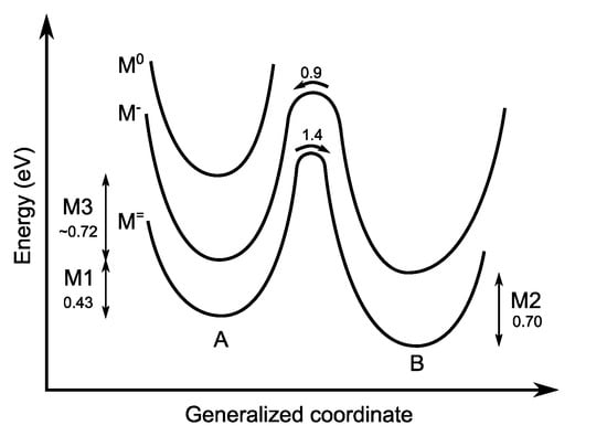 Coordinate configuration diagram for the M-center constructed based on M1, M2, and M3 activation energies determined from DLTS measurements on neutron irradiated (1013 cm−2) SBD and activation energies for transitions between A and B configurations of M-center taken from []. All energy values are in the eV unit.
