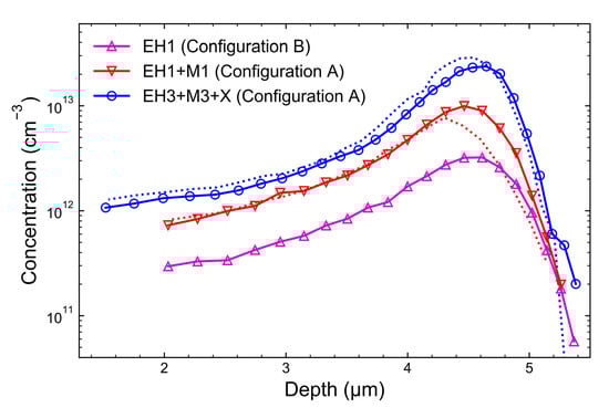 EH1, EH1 and M1, and EH3 and M3 depth concentration profiles in 7.5 MeV C (108 cm−2) ion implanted SBD. The shown EH1 + M1 concentration profile (Configuration A) was measured after cooling SBD from 340 K down to 210 K under −30 V bias, while EH1 profile was measured after cooling down SBD from 450 K without bias. Depth profiles measured before 450 K annealing (as seen in Figure 6) are shown with dotted lines.