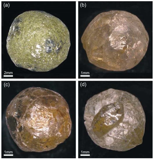 Most natural ballas and ballas-like diamonds with curved dissolution faces obtained their final spherical shapes by resorption [2,6,11,13,33] probably in the water-containing melt; this is confirmed by the fact that, at present, all known ballas diamonds have been found only in the placers in Brazil, South Africa, the Urals, and Yakutia, in association with diamonds of curved face dodecahedra and cuboids that passed through intensive bulk dissolution [36,37].
