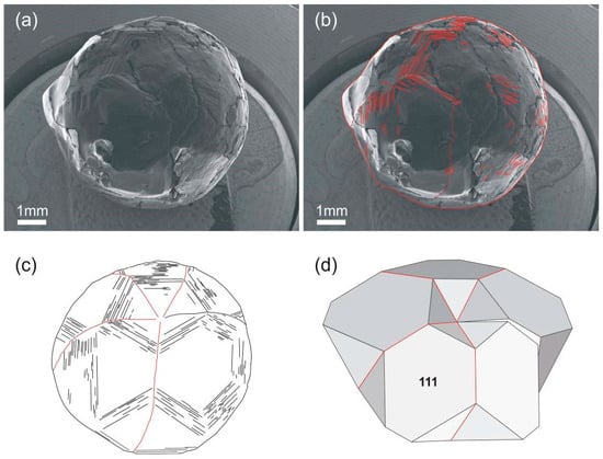 Signs of regular accretion of diamond crystals that constitute the spherical diamond are revealed in observation of the crystallographic orientation of a system of hatching lines and a stepped relief of its surface (Figure 5a). Obviously, the shading is parallel to the edges of the octahedra of the cyclic twin of diamond crystals, and it is highlighted with red lines in the image retouching (Figure 5b) and is shown with black lines in the diagram of the structure of the twin intergrowth (Figure 5c). Twin seams between octahedral crystals appear well on the dissolved surface of the spherical diamond and are shown with red dashed lines in Figure 5b and with solid red lines in Figure 5c,d.