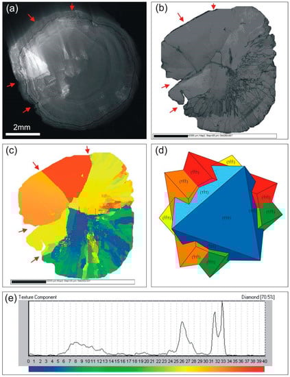 Polished central cut of ballas-like diamond RB-4: (a) CL image; (b) Reflected light; (c) EBSD image; (d) Interpretation of the multiple twining of crystals along (111); (e) Texture component diagram. The twin boundaries are marked in (a–c) with red arrows.