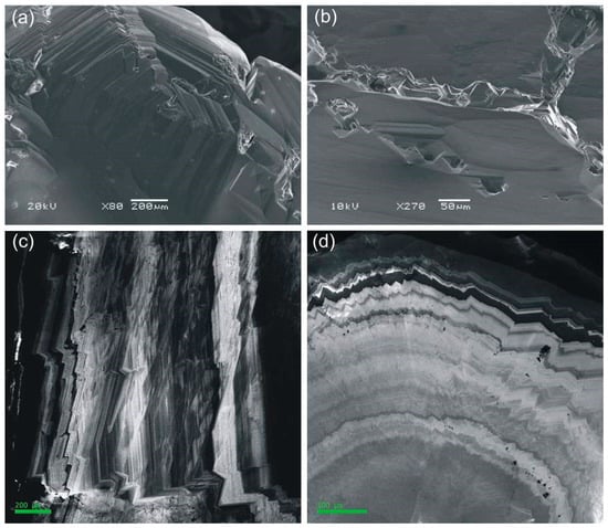 According to the CL image, the diamond consists of many radially oriented crystalline subindividuals separated from each other by microcracks and intergrowth boundaries. They exhibit a fine octahedral zoning, which reflects the growth trajectories of the vertices of the set of crystallites that compose the outer region of the diamond (Figure 9a–d). Subindividuals gradually increase in size. The tops of some of them, crossed by adjacent subindividuals, either stopped in development or changed the direction of growth (Figure 9d). The image of octahedral subindividuals growing on a cubic face composed of individual crystallites resembles a druse with a predominantly radial direction of crystal growth and displays phenomena of geometric selection (Figure 9d).