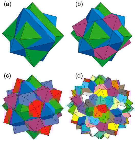 The idealised geometric model of multiple twinning, according to the Spinel Law, can be visualised by adding new components to the twin intergrowth suggested by Ch. Slawson [39], who provided an example of cyclic twinning along (111), which is widespread in diamonds, in the form of germination of three octahedral individuals (Figure 11a).