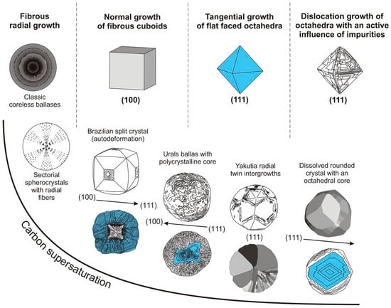 A decrease of supersaturation (supercooling) leads to the following sequence of crystal formation: spherulites > sheaf-like aggregate > contact and penetration twins > single crystals [53]. Therefore, the position of ballas diamonds with multiple radial twin crystals on a crystal-genetic scheme is between the area of normal crystal growth and the area of tangential growth of octahedral crystals (Figure 12).
