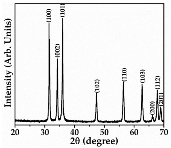 Figure 1 shows the typical x-ray diffraction (XRD) pattern of as-synthesized ZnO nanosheets. The observed XRD pattern exhibited various diffraction peaks appeared at 2θ = 31.3°, 34.2°, 35.9°, 47.3°, 56.4°, 62.8°, 66.2°, 67.8° and 69.0° indicating the ZnO crystal planes of (100), (002), (101), (102), (110), (103), (200), (112) and (201), respectively. The observed diffraction peaks are attributed to the pure ZnO and well consistent with the JCPDS card no. 076-0704 and reported literature [46,47]. The observed diffraction pattern possesses fine peaks, which indicate the good crystallinity of the synthesized ZnO nanosheets. The crystalline size of the synthesized material was calculated using Debye-Scherrer formula [48,49,50] and found to be nearly 70 nm. By comparing the observed diffraction pattern with the standard JCPDS Card no. 076-0704 of ZnO pure phase, it was observed that the relative intensity of (100) peak is greater than (101) peak which confirms the crystal growth perpendicular to (100) plane.
