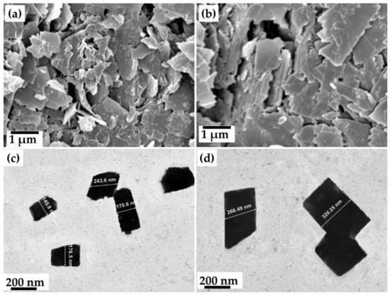 The morphologies of the synthesized ZnO-NSs were examined by Scanning Electron Microscopy (SEM) and Transmission Electron Microscopy (TEM) and results are shown in Figure 2. Figure 2a,b exhibit the typical SEM images of as-synthesized product which confirmed the successful growth of nanosheet-shaped structures. The nanosheets are grown in very high density, thus overlapping each other. The typical size of the nanosheets is in the range of 1–1.2 µm. Some smaller nanosheets are also seen in the observed SEM micrographs. Figure 2c,d show the typical TEM images of the nanosheets. For the TEM analysis, the synthesized ZnO nanosheets powder was ultrasonicated in acetone and a drop of acetone which contained nanosheet was placed on the copper grid and examined. Due to ultrasonication, the nanosheets are broken into small sizes. As observed in the TEM images, various sizes of nanosheets are seen. Interestingly, the nanosheets exhibited smooth and clean surfaces.