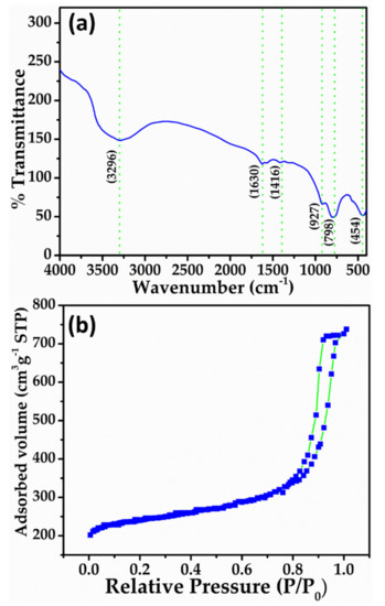 By applying adsorption-desorption isotherm using Brunauer-Emmet-Teller (BET), the surface area of the synthesized ZnO nanosheets was examined. The plot of adsorption-desorption nitrogen isotherm between relative pressure vs. volume adsorbed presents the amount of nitrogen gas adsorbed on to the surface of adsorbent as well as amount of that gas desorbs at normal temperature. This amount of gas adsorbs into the mesoporous area due to high temperature operation and this mesoporosity is revealed by hysteresis behavior. Figure 3b depicts the typical adsorption-desorption isotherm of as-synthesized ZnO nanosheets. According to the observed adsorption-desorption isotherm graph, the calculated surface area of the synthesized ZnO nanosheets was found to be 948 m2/g. This BET surface area is still too high to achieve ideal performance as an adsorbent [56]. The interconnected porous structure would significantly upsurge the effective surface area that improves the adsorption performance [57]. The size of the adsorbent pores also affects the adsorption process. Adsorption of Cr6+ ions on the surface of the ZnO-NSs upsurges as the pore size decreases since the contact point between the surface of adsorbate and adsorbent increases [58].