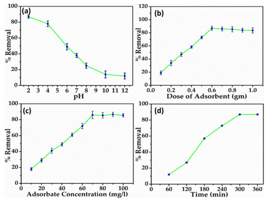 Kinetics behavior shows the efficiency of the adsorbent and speed of adsorption, adsorption constant and desorption constant values for adsorbent. Kinetics also decides the order of reaction and value of adsorption capacity with time. The observations have proved that the solution pH is the supreme parameter in controlling adsorption, seems with important impacts on the chemistry, solubility, surface charges, dissociation of the analyte and functional groups of adsorbent [59,60,61]. The effect of solution pH (2–12) on the removal efficiency (%) of Cr6+ions is illustrated in Figure 4. The dissociation of water molecules generates H+ and OH-ions which may adsorb at the interface of aqueous solution-ZnO nanosheets that can affect the variation in adsorption with time [62]. The pH of solution influences metal speciation chemistry and surface metal binding sites of the sorbent [63]. The pH of the solution may affect the surface properties of adsorbent and ion formation properties of chromium [64]. From Figure 4a, maximum adsorption was observed at low value of pH while diminution in adsorption rate was observed at high value of pH due to less competition offered by OH− ions with Cr6+ions. The adsorption reaches a maximum of pH 2 which was considered as optimized pH value for Cr ions removal. However, the percentage of removal of ions from aqueous solution was observed to be decreased with an increase in the pH value. Cr6+may be accessible in the form of Cr2O72−, HCr2O7−, CrO42− and HCrO4− ions that depends on some parameters such as solution pH, Cr6+concentration and temperature [65].